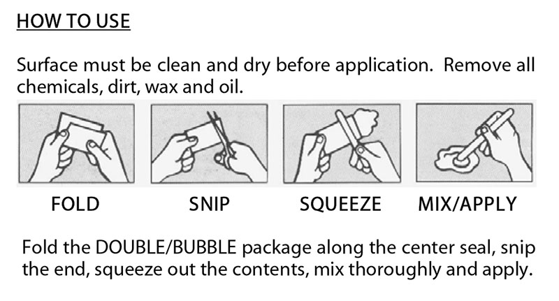 Surface must be clean and dry before application. Remove all chemicals, dirt, wax and oil. Fold the DOUBLE/BUBBLE® package along the center seal, snip the end, squeeze out the contents, mix thoroughly and apply. |